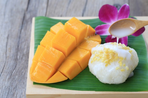 Mango sticky rice is a traditional Southeast Asian and South Asian dessert made with glutinous rice, fresh mango and coconut milk, and eaten with a spoon or the hands.